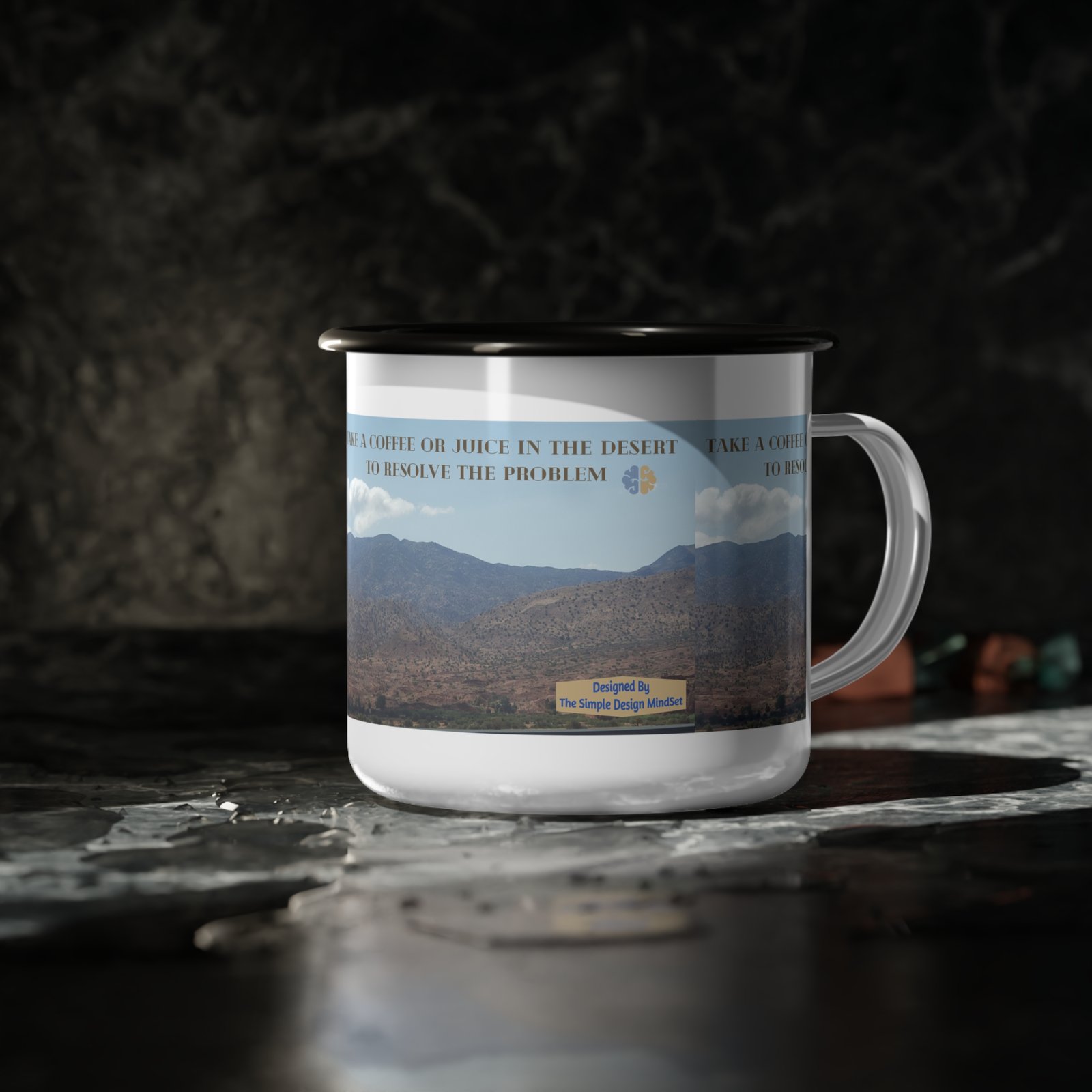 Inspirational Enamel Camp Cup – White – 12oz – TAKE A COFFEE OR JUICE IN THE DESERT TO RESOLVE THE PROBLEM